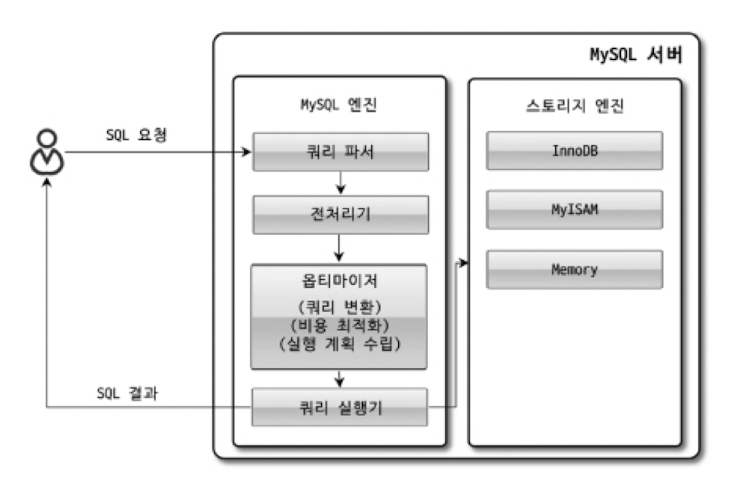 - MySQL 에서 MyISAM 이나 InnoDB 와 같이 다른 스토리지 엔진을 사용하는 테이블에 대해 쿼리를 실행하더라도 MySQL 의 처리 내용은 대부분 동일하다.