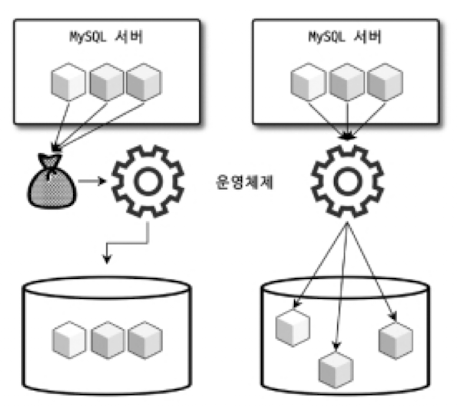- 데이터베이스 대부분의 작업은 이러한 작은 데이터를 빈번히 읽고 쓰기에 MySQL 서버는 그룹 커밋이나 바이너리 로그 버퍼, 또는 InnoDB 로그 버퍼 등의 기능이 내장되어 있음.