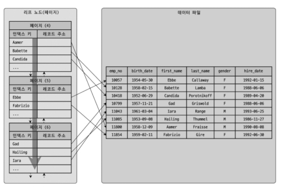- 인덱스의 리프 노드는 하상 실제 데이터 레코드를 찾아가기 위한 주솟값을 가지고 있다. (220p)