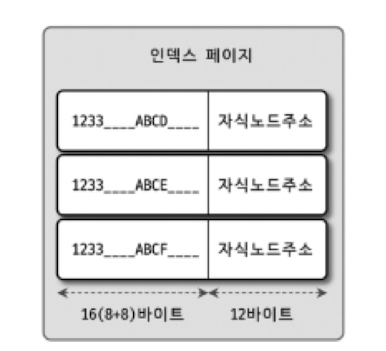 - 인덱스의 키가 16바이트라고 가정하면 위 그림처럼 인덱스 페이지를 구성할 수 있음.