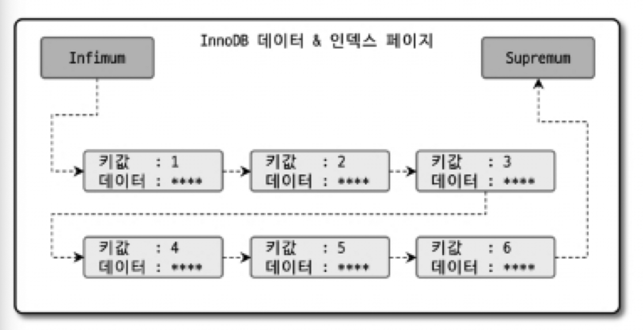 위 그림에서 InnoDB 페이지 내부의 레코드들이 정렬 순서대로 저장되어 있는 것처럼 표시되어 있지만, 실제로 InnoDB 페이지는 힙(Heap) 처럼 사용되므로 물리적으로 저장이 순서대로 배치되지는 않음.