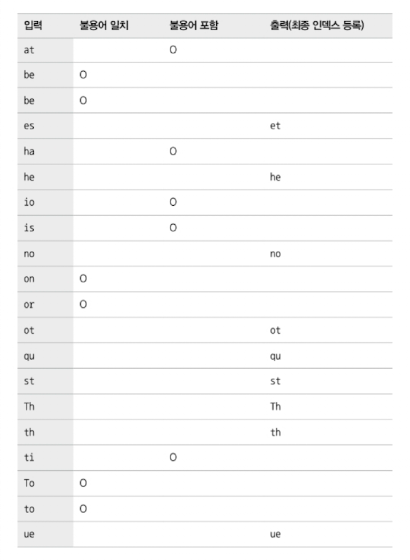 - 이때, 불용어와 동일하거나 불용어를 포함하는 경우, 걸러서 버림.
