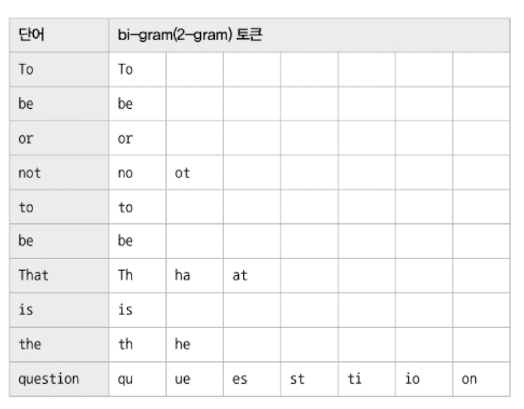 - n글자 단어라면, 그 단어는 2-gram 알고리즘에서는 n-1개의 토큰으로 구분됨.