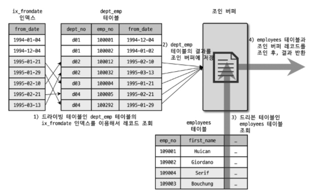 - 옵티마이저는 드라이빙 테이블에서 읽은 레코드를 메모리에 캐시한 후 드리븐 테이블과 이 메모리 캐시를 조인하는 형태로 처리함.