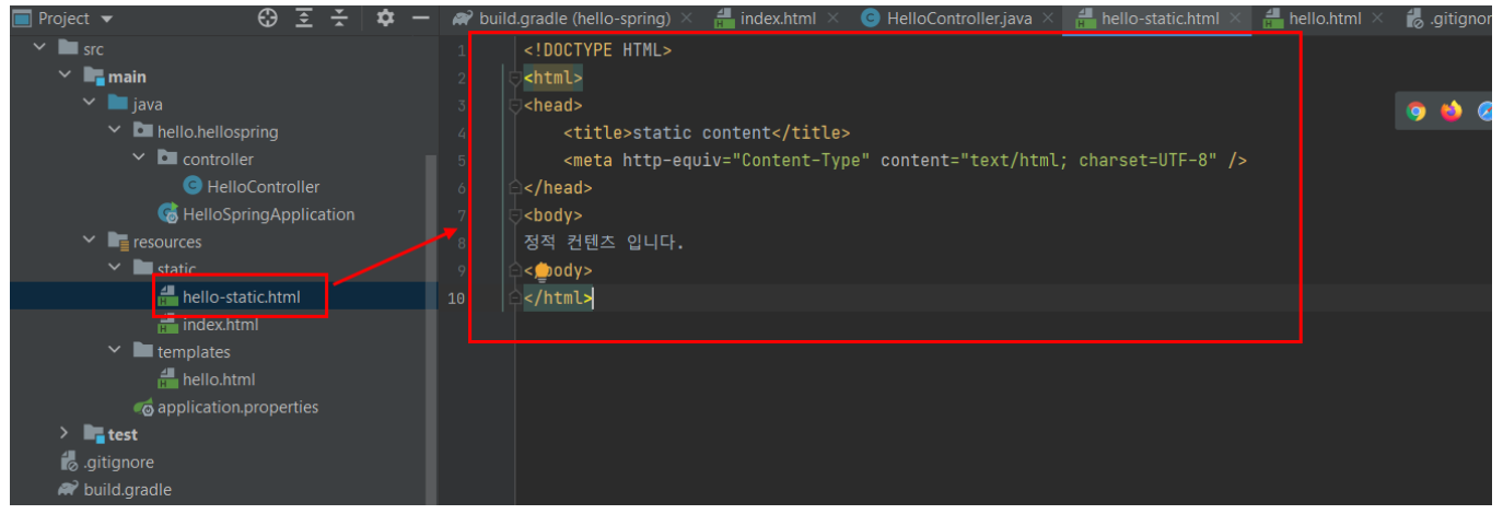 hello라는 컨트롤러는 있었지만 hello-static 컨트롤러는 없다. 그다음에 스프링 내부적으로 resources의 static에 hello-satic을 찾는다. 그래서 그게 있으면 그대로 반환한다!