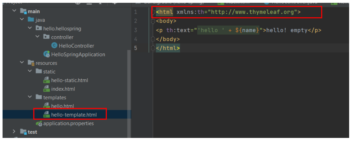 컨트롤러에서 name은 spring!으로 바뀌고 model안의 name도 spring!으로 바뀌면서 모델에 담긴다. 그리고 hello-template으로 넘어가면