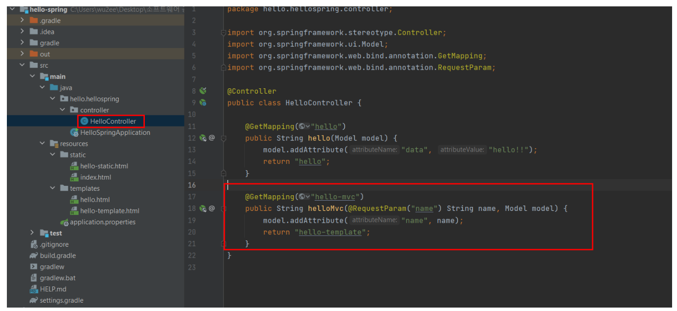 컨트롤러에서 name은 spring!으로 바뀌고 model안의 name도 spring!으로 바뀌면서 모델에 담긴다. 그리고 hello-template으로 넘어가면