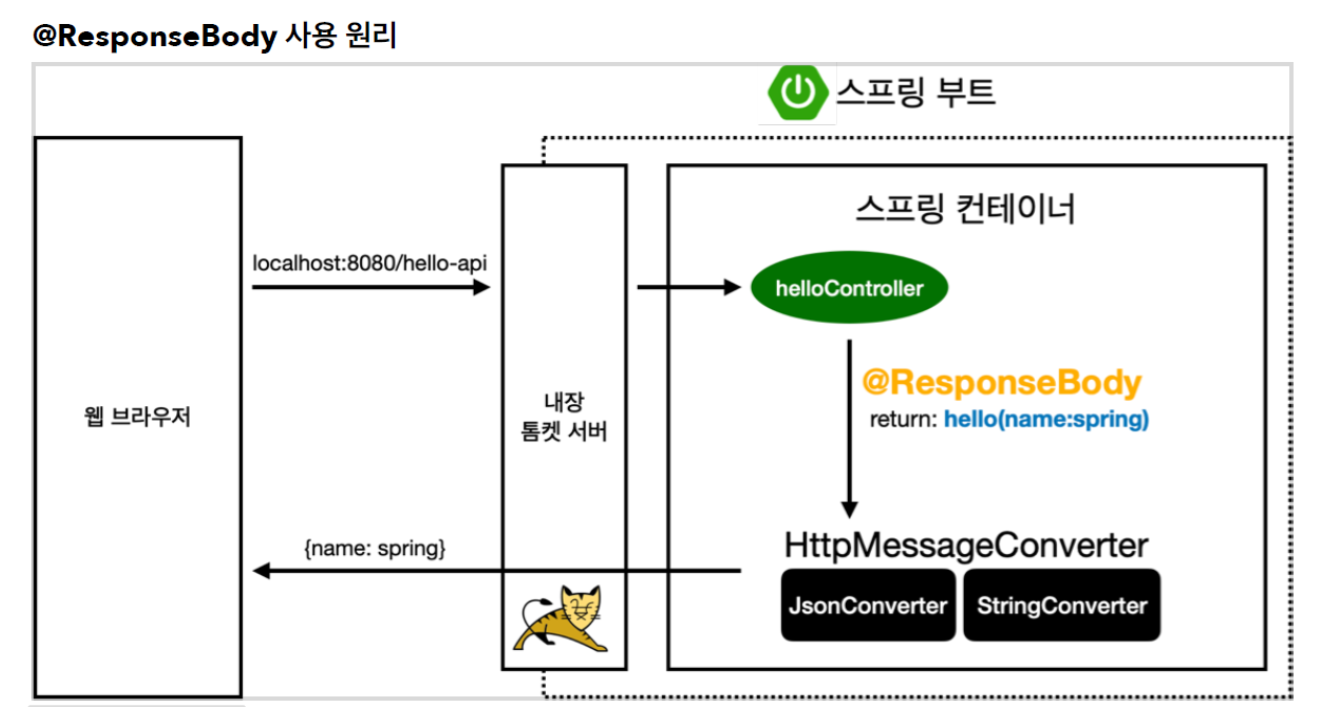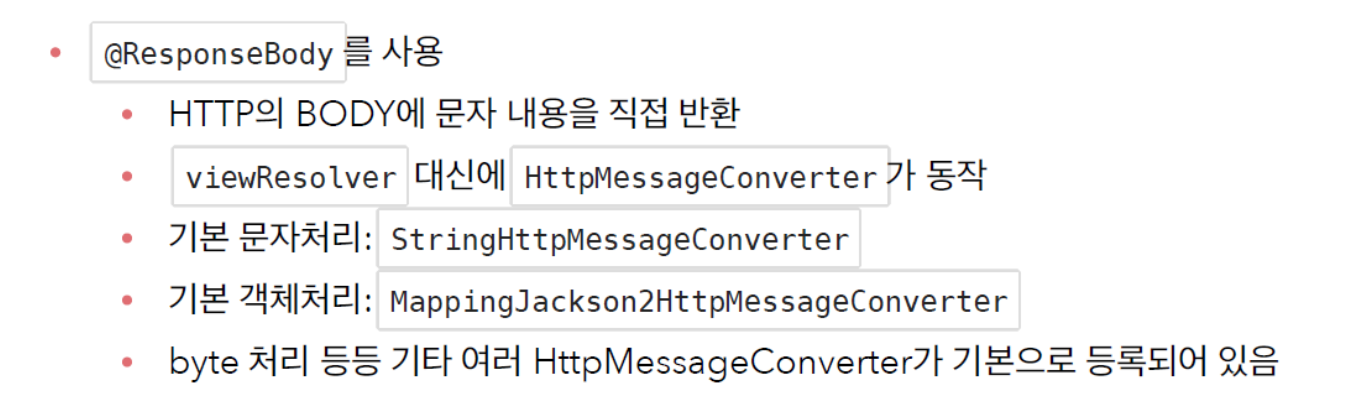 리스폰스 바디라는 어노테이션이 달려있으면 스프링은 원래 저 어노테이션이 없으면 뷰리졸버한테 던져주는데, 얘는 리스폰스바디가 있으면 http응답에 그대로 데이터를 넘겨야 되겠구나 라고 동작한다. 그런데 반환값이 문자가 아니라 객체다? 문자였으면 그냥 문자를 http에다 그냥 딱 줬다. 그럼 끝!