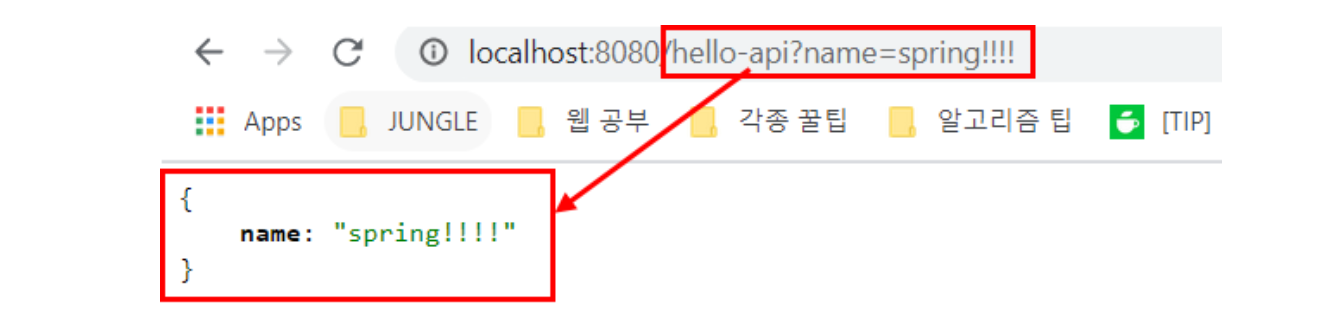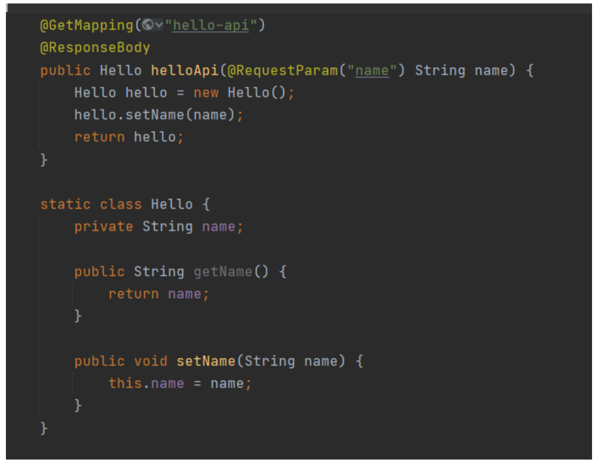 getter setter를 만들고 helloApi라는 메소드 생성한다. 이때 return값으로 문자가 아닌 객체를 반환한다. 위와 같은 방식을 api방식이라고 말한다.