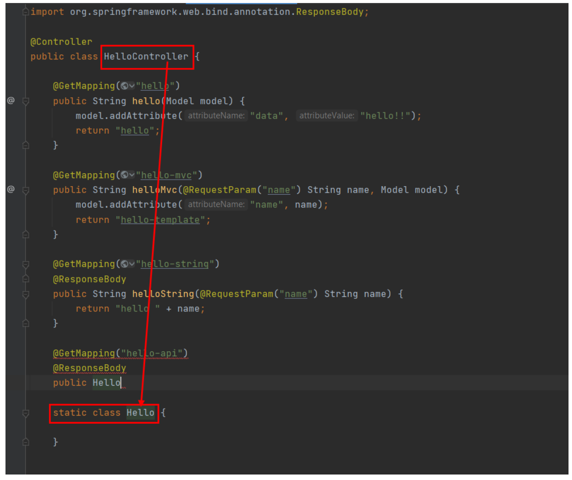 여기서 HelloController라는 객체안에 Hello라는 객체를 만들고 싶다면 static을 써서 만들 수 있다. 그럼 HelloController.Hello~~ 이런식으로 쓸 수 있다. (자바에서 정식으로 지원하는 문법임)