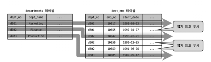 - 이 상황이라면 조인하면서 DISTINCT 처리로 인해, 중복된 dept_no 를 무시하고 꼭 필욯나 것만 조인함.