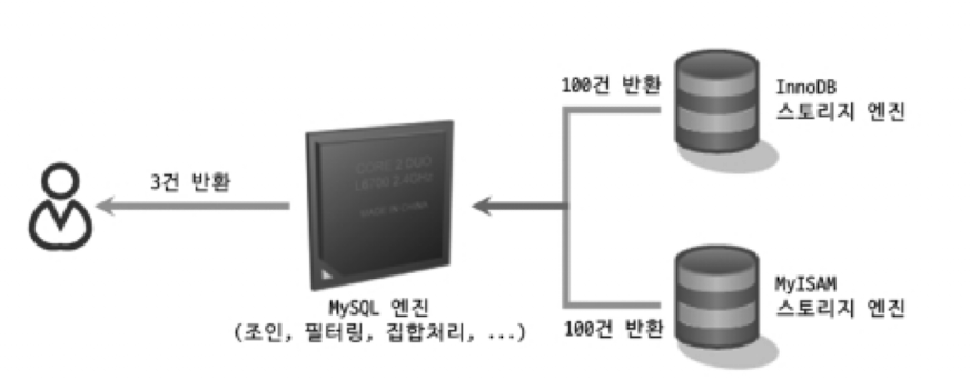 - 각 스토리지 엔진은 디스크나 메모리상에서 필요한 레코드를 읽거나 저장하는 역할을 하며, MySQL 엔진은 스토리지 엔진으로부터 받은 레코드를 가공 또는 연산하는 작업을 수행함.
