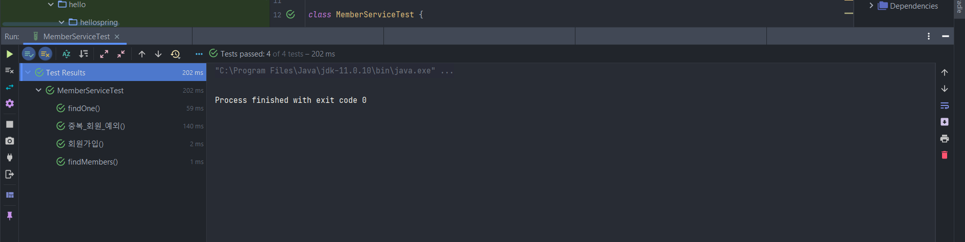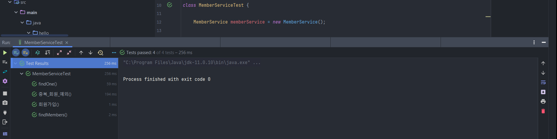BeforeEach 메서드와 앞에서 만든 생성자를 통해 테스트 실행할때마다 같은 메모리의 리포지토리 인스턴스를 사용하게 만들 수 있다.