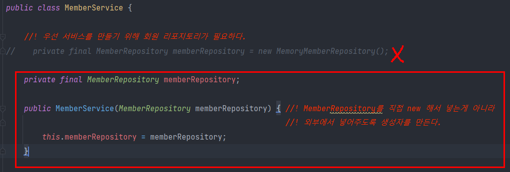public MemberService(MemberRepository memberRepository) { //! MemberRepository를 직접 new 해서 넣는게 아니라