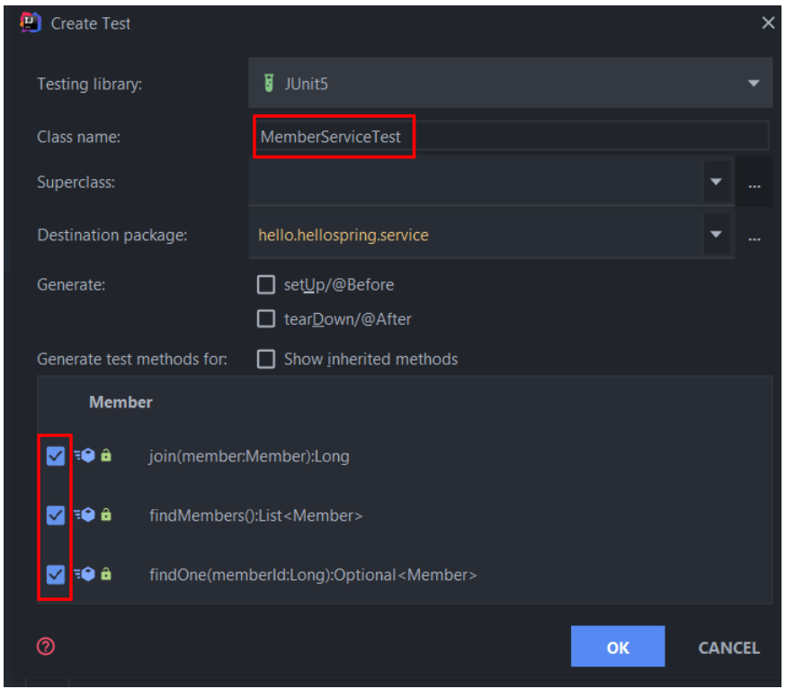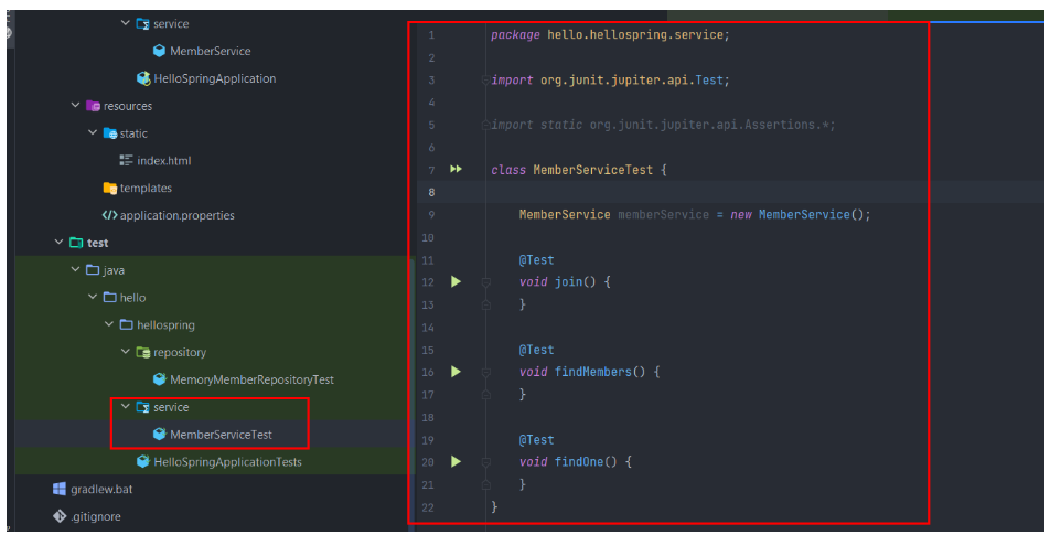 MemberService뒤에 Test가 자동적으로 붙는다.