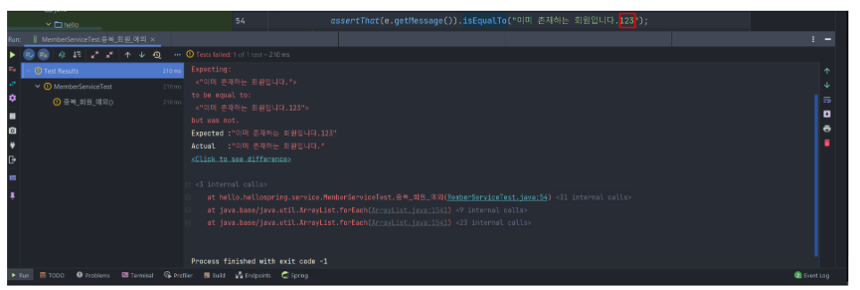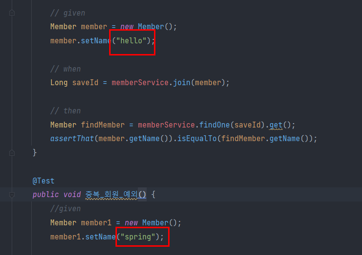 이름을 다르게 썼기때문에 충돌이 안난 것이었다. 만약 저 회원가입 테스트 메서드에 hello대신 spring으로 바꿨다면?