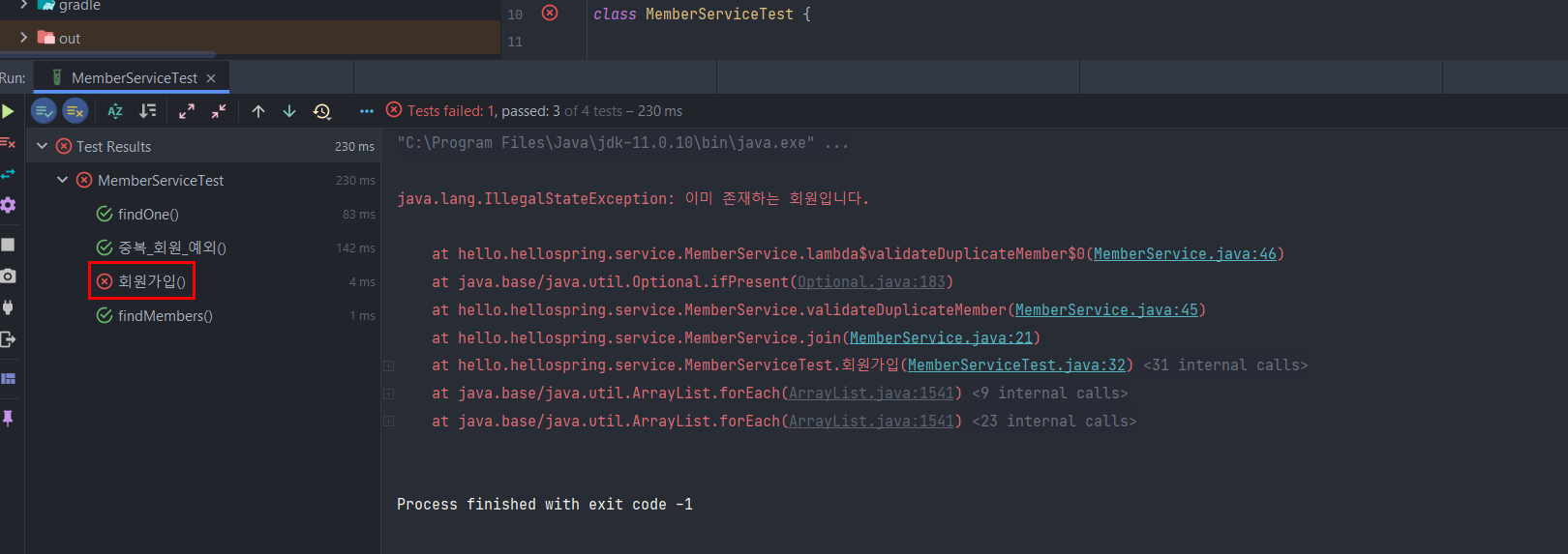 // junit 메서드, 강제로 fail 시킴. 이 코드까지 온다는건 중복회원이 아니란 뜻이기 떄문