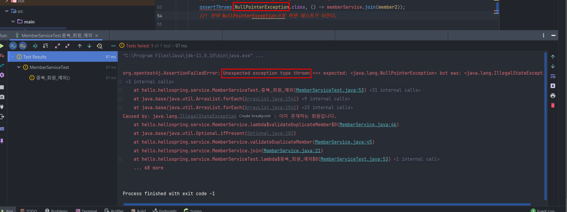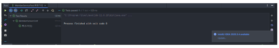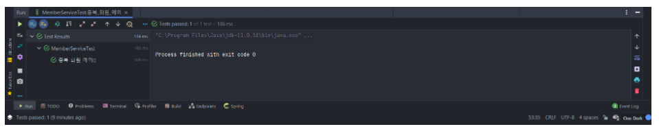 지금 짠 테스트는 거의 반쪽짜리 테스트나 다름없다. 회원가입의 핵심은 중복 회원 검증되는 로직을 타서 터지는 것도 봐야한다.