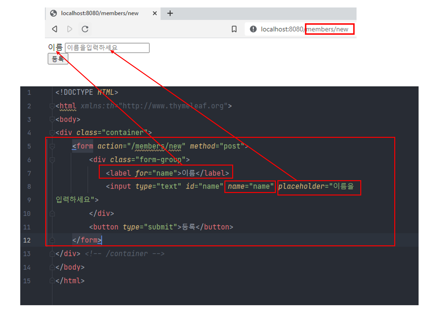 html에 form으로 묶여있는데, 웹에서 spring이라고 친다면 post로 {name : spring} 으로 날아가게 된다.