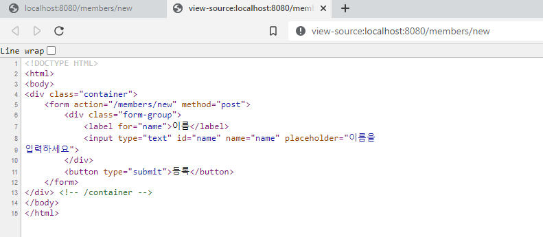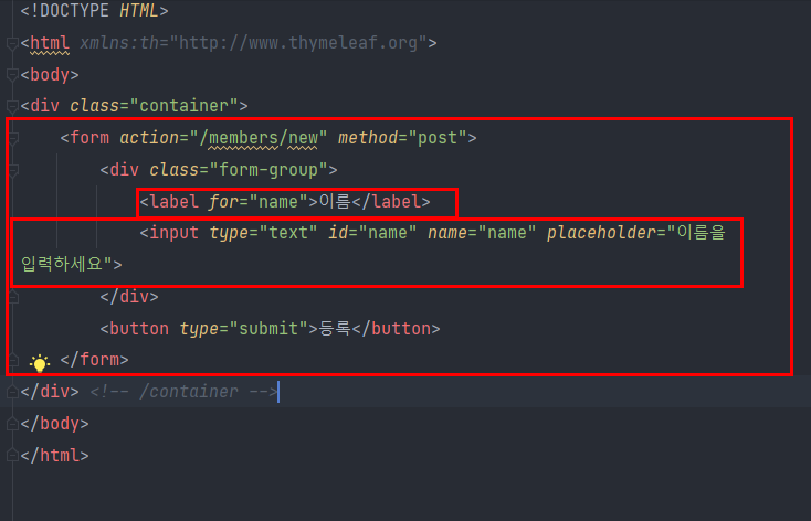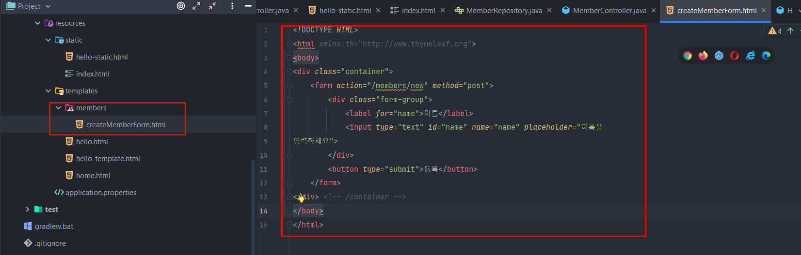 그리고 templates안에 members라는 폴더를 만들고 createMemberForm.html을 만든다.