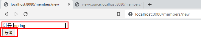여기서 spring을 입력후 등록 버튼을 누르면 /members/new가 post방식으로 넘어간다.