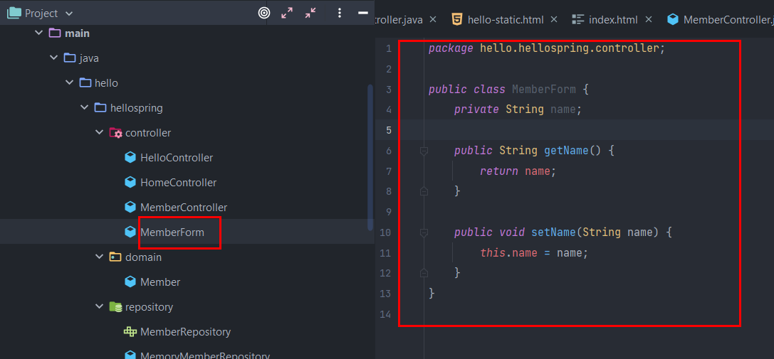 MemberForm 클래스를 만들고 private String name; 을 선언하면 name 에 아까 등록한 이름인 'spring'이 들어가게 된다.