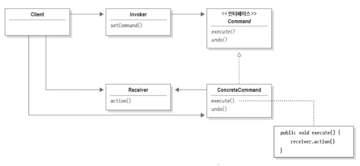 - 인보커에서 execute() 호출하면, ConcreteCommand 객체에서 리시버에 있는 메소드를 호출해서 그 작업을 처리함.