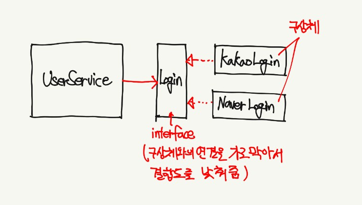 // 결합성 : UserService가 KakaoLogin이나 NaverLogin같은 구상체와 결합하게 되면 결합성이 강하다.