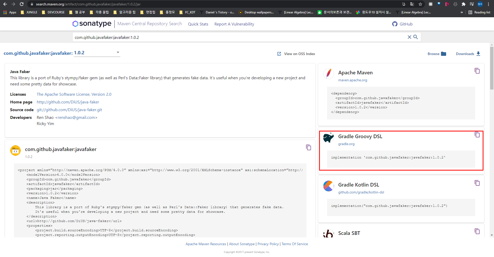 mavenCentral에서 javafaker의 1.0.2버전에 해당되는 라이브러리를 다운받아서 우리가 사용할 수 있도록 프로젝트에 내장해 준다.