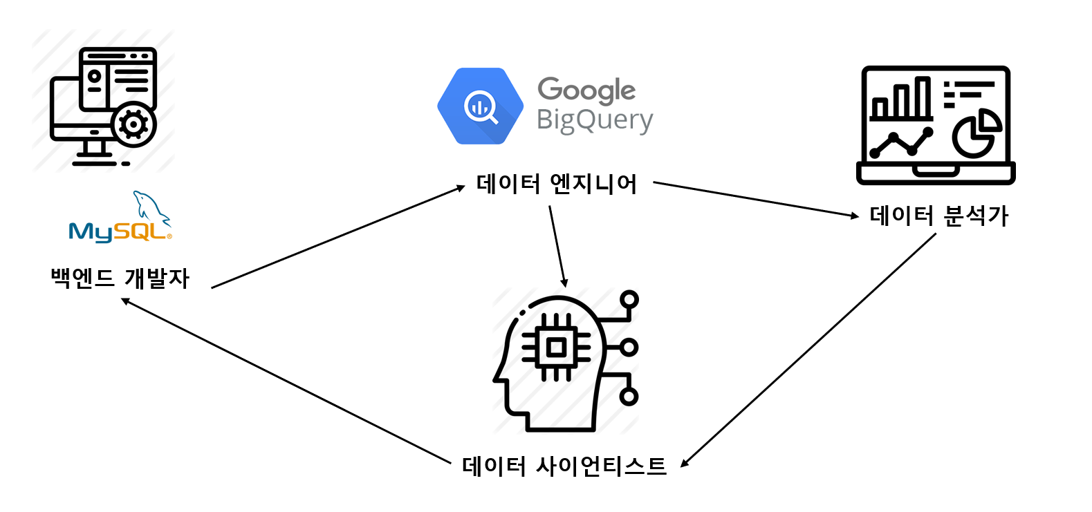 또한 사이트에 접속하는 여러 트래픽과 유형들을 프로덕션용 관계형 데이터베이스 뿐만아니라 데이터 엔지니어들이 데이터 웨어하우스에 데이터를 정제하여 적재하고, 데이터 분석가들이 그 데이터를 보며 추이를 분석하고, 데이터 사이언티스트 들이 데이터를 기반으로 사용자에게 추천상품을 주는 등의 작업을 수행하게 된다. 이를 통해 다시 사용자에게 데이터를 제공하게 된다.