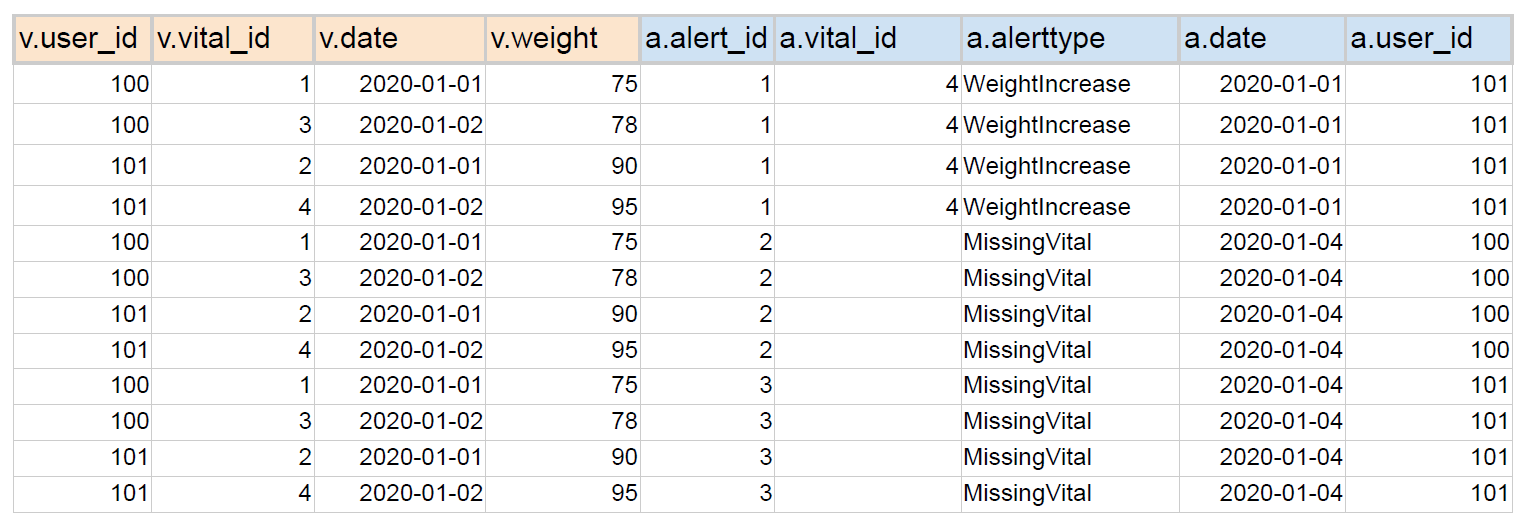 SELECT * FROM prod.vital v CROSS JOIN prod.alert a;