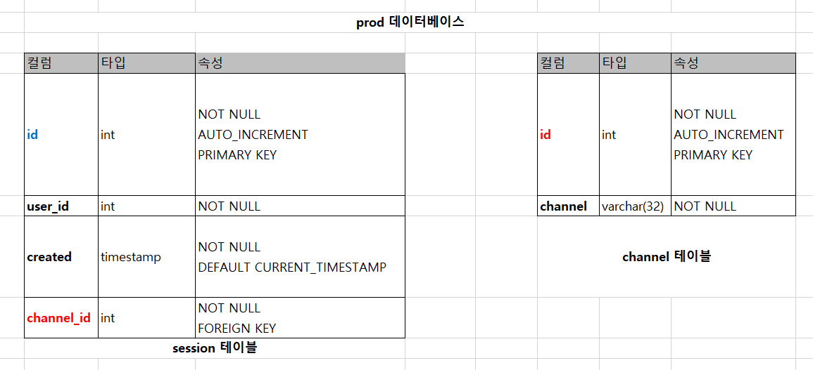 세션 테이블에 채널테이블의 id 컬럼과 연결시키기 위해 foreign key로 연결할 수 있다.