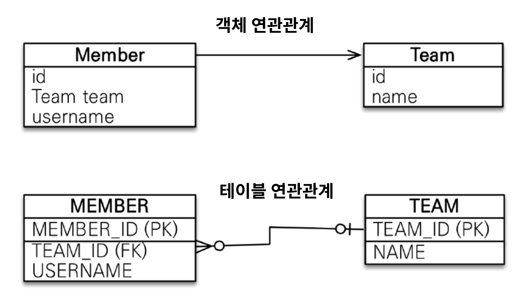 반면, 객체는 멤버에서 팀으로 밖에 조회할 수 없다. (위 그림은 단방향 이기 때문. 추후 양방향 연관관계에 대해 배움)