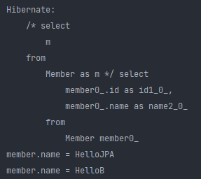 실제로 쿼리는 id, name 필드를 select 하지만, JPQL에서는 m, 즉 멤버 엔티티를 선택한 것이라고 보면 된다.