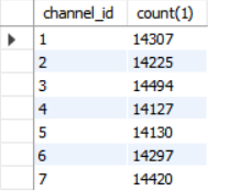 prod라는 데이터베이스의 session 테이블에서 channel_id 필드를 그루핑하고 그 channel_id가 몇개씩 있는지 카운팅하여 출력하면됨 (여기서 만약 GROUP BY 2이면 SELECT 뒤에 나오는 필드중, 2번째에 해당된느 필드로 그루핑하라는 의미임.), 여기서 count(1), 괄호안에 1은 신경쓰지말고 그루핑했을때 레코드 수가 몇갠지 세주는 기능으로 생각하면 됨.